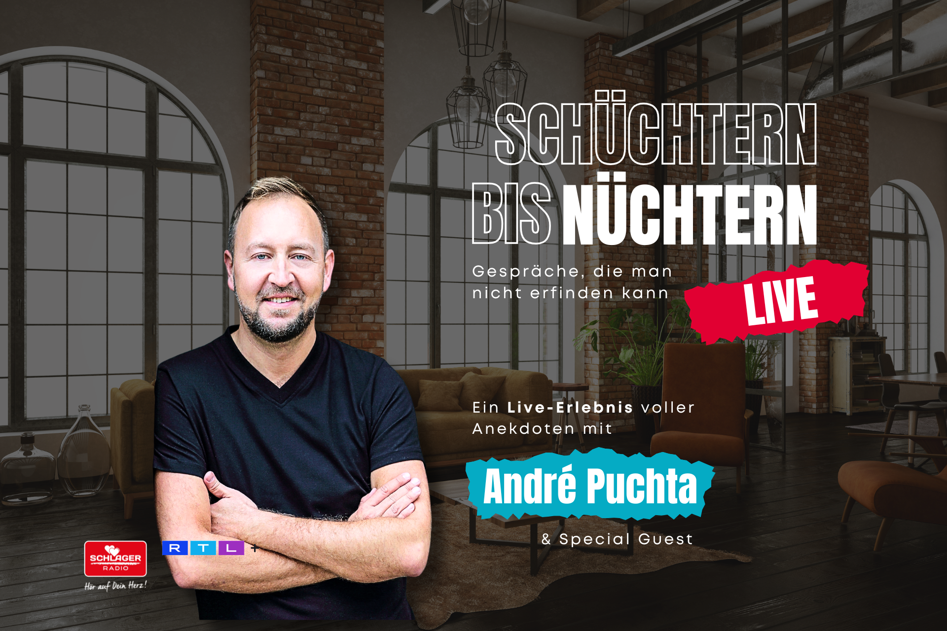 Seit Juni 2022 begrüßt Kommunikations-Experte und Autor André Puchta im Podcast „Schüchtern bis nüchtern“ (RTL+, Schlager Radio, YouTube) Menschen mit außergewöhnlichen Berufen, Lebensentwürfen oder Leidenschaften. Eine Bühne für Biografien, die man nicht erfinden könnte – und gerade deshalb viel über unsere Gesellschaft erzählen. In seiner Geburtsstadt Münchberg bringt André Puchta am Freitag, 16. Oktober 2026 prägende Begegnungen live on Stage, blickt auf rund 100 packende Audio-Folgen zurück – und entführt die Zuschauer in eine Welt voller überraschender Wendungen.